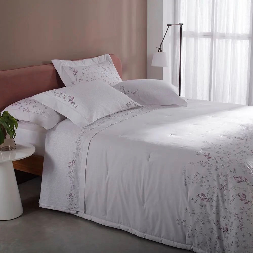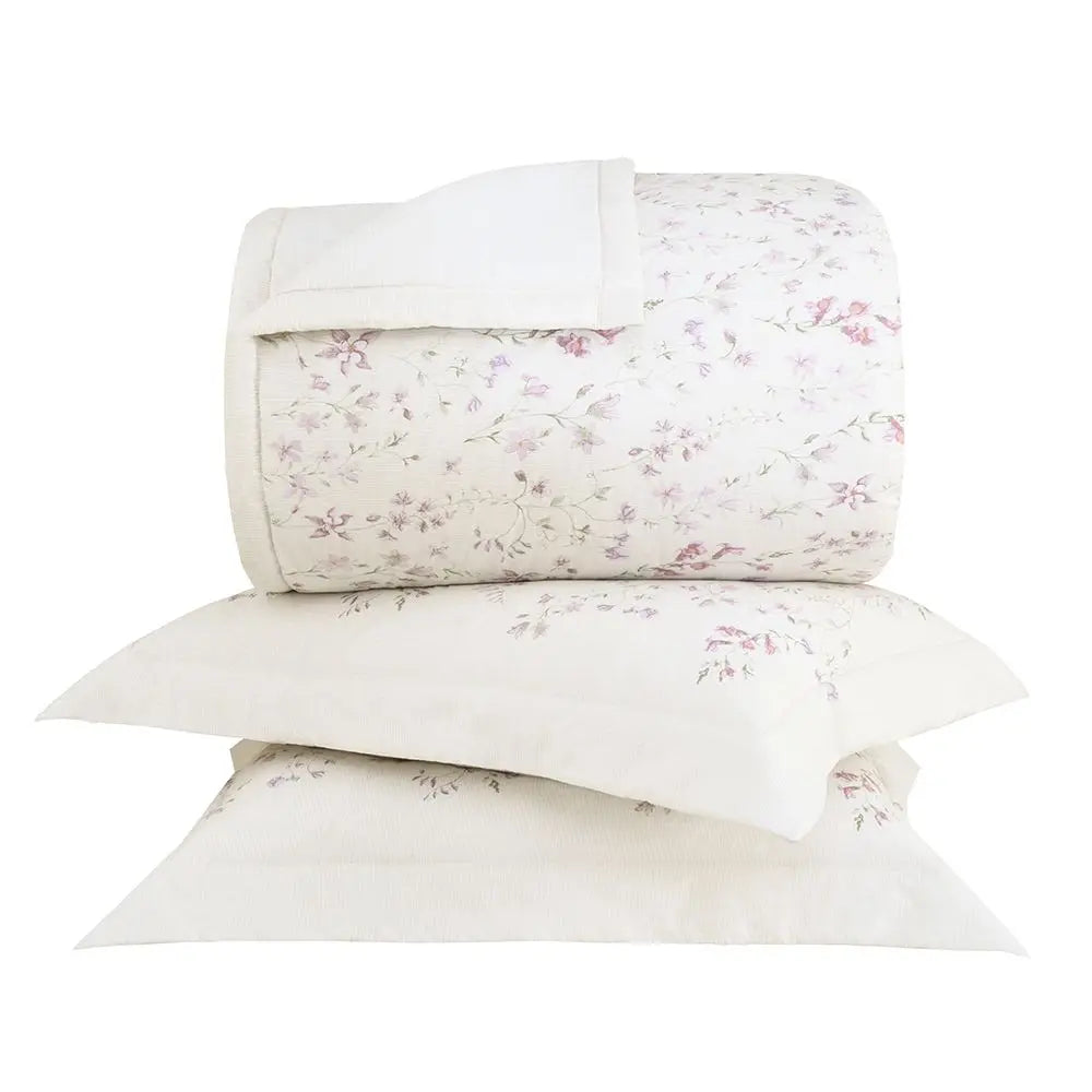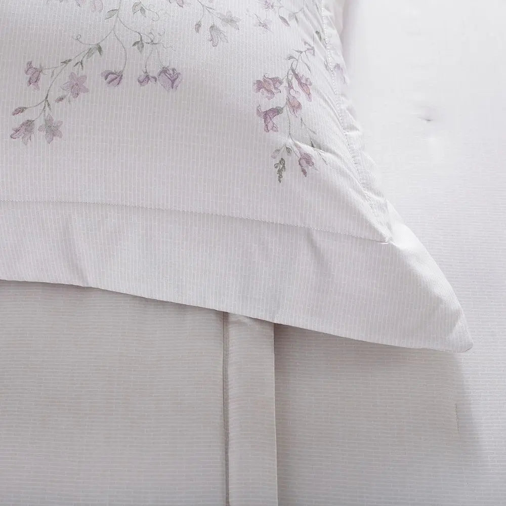 En este juego de colcha acolchada, el estampado floral resalta en el fondo, inspirado en elementos de cestería, aportando elegancia y modernidad. Fabricado en Gran Percal con 200 hilos de puro algodón de fibra larga, este modelo ofrece una suavidad excepcional y un tacto agradable, que proporciona una cama perfecta.